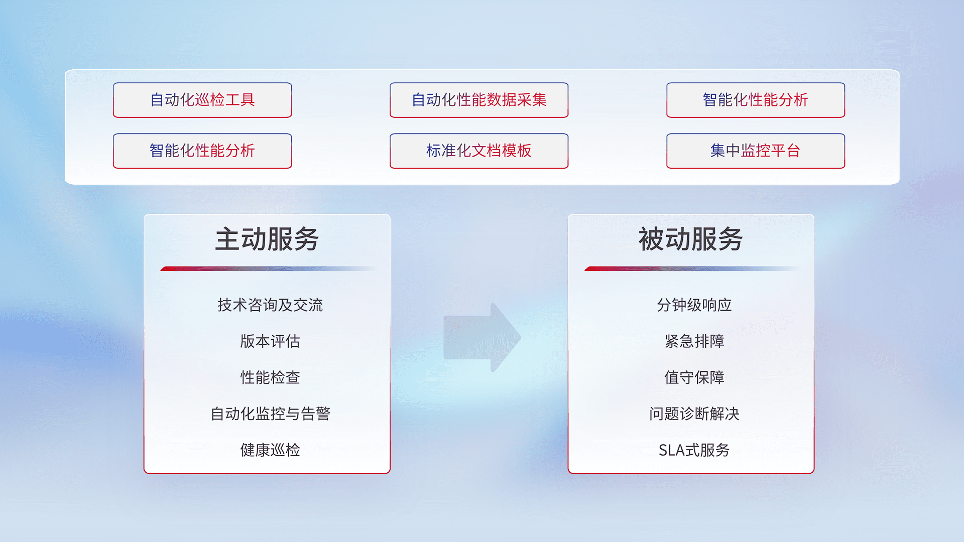 智能化工具和标准化文档,,,保障服务质量,,,,提供主动服务(包含技术咨询、、、、版本评估、、、性能检查、、、、自动化监控与告警、、健康巡检)和被动服务包含(分钟级响应、、、紧急排障、、、值守保障、、、、问题诊断解决、、SLA服务)。。。。