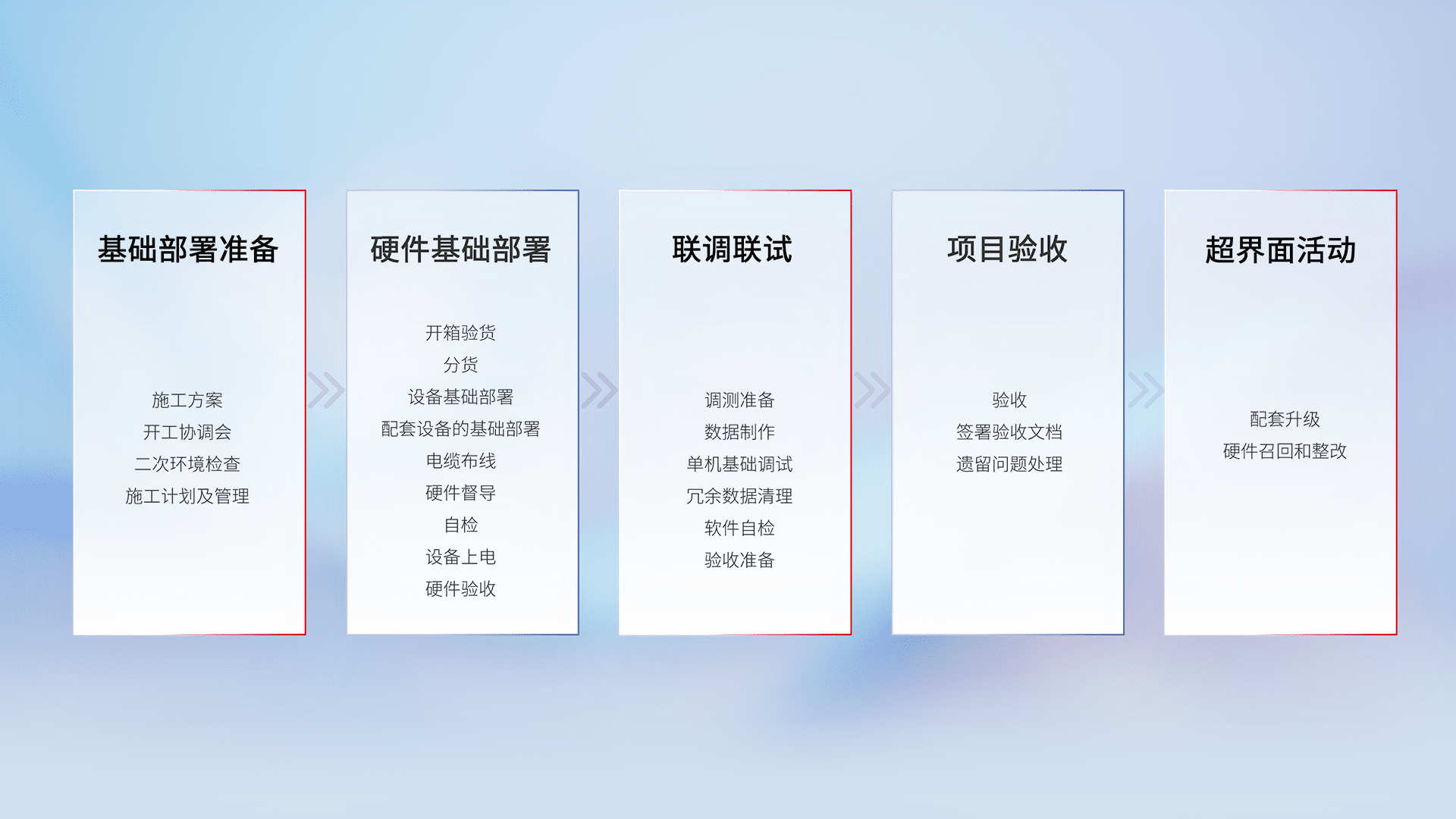 从基础部署准备、、、、硬件基础部署、、、联调联试、、、、项目验收、、、越界面活动的全过程可追溯,,,保证施工质量和进度。。。。
